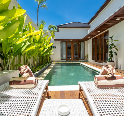 The villa is designed across three separate buildings, creating a sense of space and privacy between the two bedrooms and the living area. At the center, a private swimming pool is surrounded by tropical greenery and warm wooden decking. Sun loungers by the pool provide a perfect spot to relax, soak up the sun, or unwind after a day out.