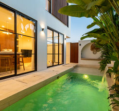 SEVU Villa No. 2, completed in 2025, offers fresh, modern, and stylish accommodations designed to impress. As you enter, you are immediately welcomed by a refreshing private pool right at the entrance, setting the tone for your peaceful stay. Step inside the fully enclosed living area, where cool air conditioning offers a comfortable escape from the tropical warmth. The space is thoughtfully designed with modern touches, perfect for lounging or entertaining.